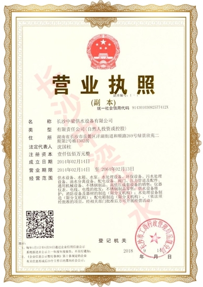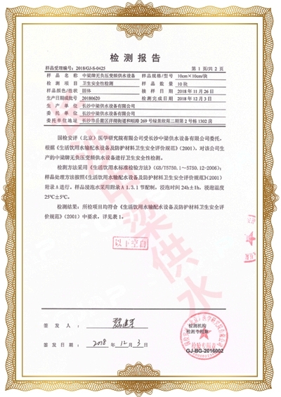 長(zhǎng)沙中梁供水設(shè)備有限公司已先后通過(guò)湖南省衛(wèi)生廳國(guó)產(chǎn)涉及飲用水衛(wèi)生產(chǎn)品衛(wèi)生許可批準(zhǔn);